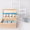 We wnętrzu skrzyni znajdziemy 6 małych pudełeczek ozdobionych drewnianymi stopkami z napisami sugerującymi ich przeznaczenie, umożliwiających przechowywanie takich pamiątek z okresu dzieciństwa jak : pierwszy ząbek, pierwszy smoczek, pierwszy loczek, opaska szpitalna, test ciążowy i zdjęcie USG . Poza nimi skrzynia stwarza możliwość zamknięcia w jej wnętrzu też innych pamiątek z Chrztu Świętego lub Roczku ( typu kartki okolicznościowe, biżuterię, białą szatkę, świeczkę z pierwszych urodzin inne drobiazgi), dzięki czemu tworzy wspaniały, sentymentalny kuferek wspomnień na długie lata!