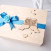 Skrzynia Wspomnień wraz personalizowanym albumem opatrzonym dedykacją na pierwszej stronie, to wyjątkowa, bezcenna i niezwykle sentymentalna pamiątka z okazji narodzin dziecka, przyjęcia Sakramentu Chrztu Świętego lub Roczku! Album mieści się idealnie we wewnętrznej stronie wieka skrzyni, jej wnętrze wyścielone jest pierzynką z drewnianych wiórów, a wierzchnia strona wieka skrzyni ozdobiona piękną, drewnianą tekturką z anielskimi skrzydłami i grawerem modlitwy „Aniele Boży” oraz delikatną dekoracją florystyczną!